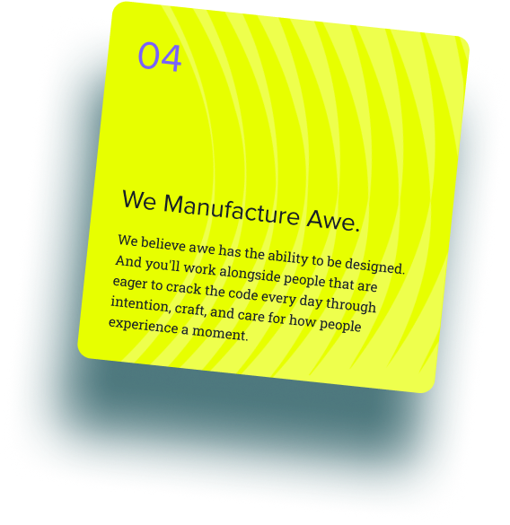 Being part of our team means caring deeply about how experiences land. It means owning your craft, and pushing beyond the expected to create moments that move people.