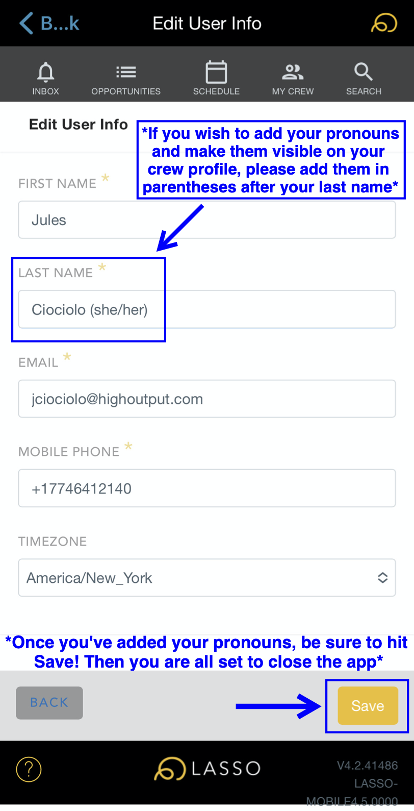 High Output, Inc. is proud to celebrate Pride and recognizes all the LGBTQIA+ freelance and full-time employees who contribute to the success of all our projects. As a step forward in fostering a culture of inclusivity, we would like to invite anyone with a LASSO account to add their pronouns to their profile. Attached is a PDF document with screenshots and a step-by-step explanation of how to do so in the LASSO app. Adding your pronouns to the end of your name will make them visible to HO staff, and any crew members who are on the same job roster as you are. This is an optional addition to your profile, but for those who would like their pronouns shared, we want you to feel welcome to do so.