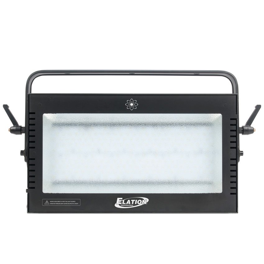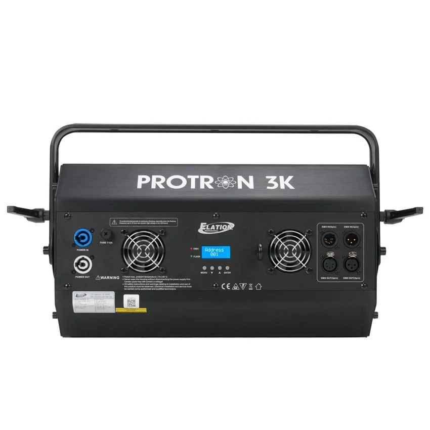 Elation Protron 3k is a high powered LED strobe featuring (202) CREE™ 3W Cool White LEDs, 80,000 lumens, 120° beam angle, (2) power modes (HIGH or LOW), strobe effect macros including burst, pulse, lighting, and full ON*, (2) silent cooling fans, electronic dimming, 3/5pin DMX and Locking Power Cable in/out connections, (4) button LCD control panel, an integrated rigging yoke, 900W max power consumption, and a multi-voltage universal auto switching power supply (100-240v). *Thermally regulated output at full max 10 seconds.