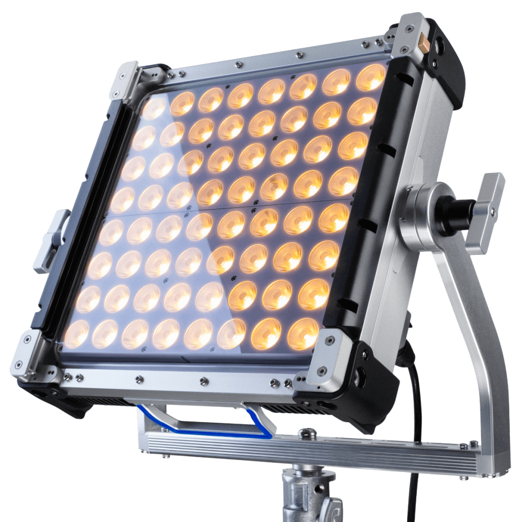 The Creamsource Vortex4 is a 1×1 RGBW All-In-One system with PSU and antennas integrated, reading 7300lux @3m on the meter. This fixture has a CCT range from 2200K to 15000K. Vortex can be used as a hard light or soft light with the Creamsource Diffuser or Dome.